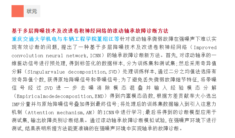 7月15日,《机械工程学报》期刊刊登了公司重庆市高校创新团队董绍江教授团队研究成果《基于多层降噪技术及改进卷积神经网络的滚动轴承故障诊断方法》。该研究成果在轴承故障诊断研究领域取得重要进展,并得到了国家自然科学基金委的资助。该成果获得《机械工程学报》2021年第1期最受关注论文榜首。