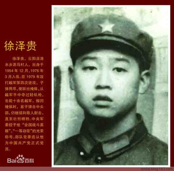 徐泽贵,中国人民解放军一级战斗英雄,35242部队战士,中国共产党员,1979年2月23日在中越边境自卫还击代乃阻击战中,徐泽贵授命在前沿阵地阻击敌人,子弹打完后奋力冲入敌群夺过敌人机枪向敌人猛烈扫射,毙敌十二名,壮烈牺牲,终年25岁。师党委给他追记了一等功;中央军委授予他“战斗英雄”(一级战斗英雄)的光荣称号。