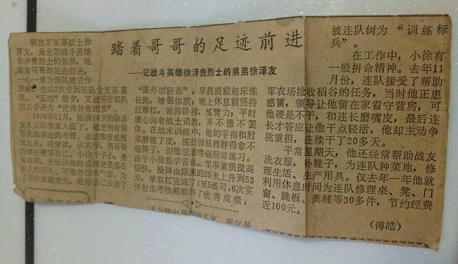 在得知哥哥壮烈牺牲的消息后,弟弟徐泽友义无反顾地追随哥哥的脚步,成为了一名光荣的解放军战士。徐泽友回忆道:“当时我只有16岁,虽然家里情况不是很好,但母亲却对我说不用担心家中,只管去就好了。”随后16岁的徐泽友就带着那本自己亲手剪辑拼贴的关于哥哥英雄事迹报道的本子参军入伍了。“因为我年龄偏小,个子小,身体单薄,开始训练时成绩总是落在别人后面,但为了追上大家,我就给自己‘加课’,早晨提前起床练长跑,晚上休息前拉单杠,做俯卧撑。” 徐泽友时刻记着自己是英雄的弟弟,也应该有英雄的觉悟和能力,在部队中他先后7次收到连队党支部嘉奖。“五四”前夕,被所在部队团工委评委“优秀共青团员”。