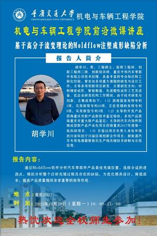 开阔员工视野,了解高分子材料成型前沿技术与发展方向,MK体育于2021年12月20日邀请重庆平伟集团胡学川高级工程师做了“基于高分子流变理论的Moldflow注塑缺陷成型分析”前沿微课专题讲座。本次讲座采用线下讲座的方式,共计有近40余名本科生、10余名硕士生及部分青年教师参与。