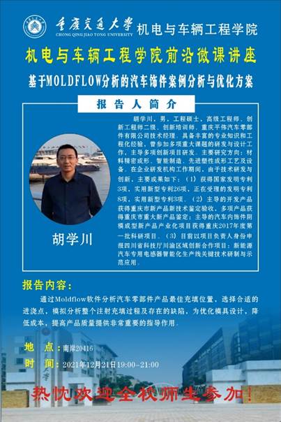 MK体育于2021年12月21日邀请重庆平伟集团胡学川高级工程师做了“基于MOLDFLOW分析的汽车饰件案例分析与优化方案”前沿微课专题讲座。本次讲座采用线下讲座的方式,共计有近40余名本科生、10余名硕士生及部分青年教师参加。