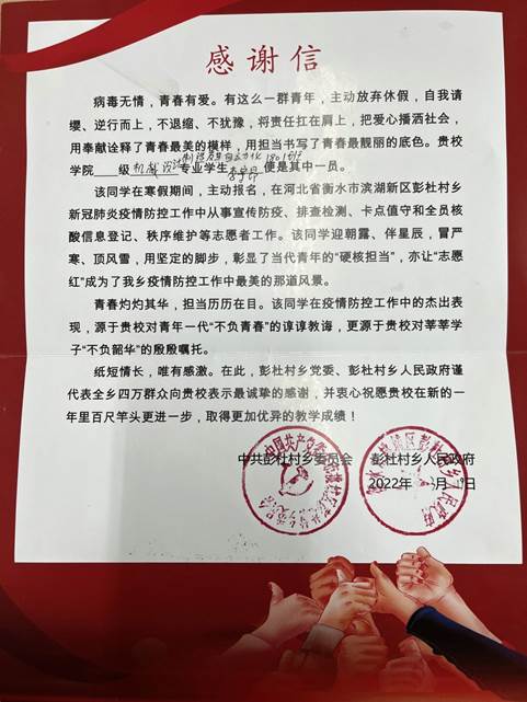 日前,MK体育收到一封来自河北省衡水市滨湖新区彭杜村乡委员会、彭杜村乡人民政府的表扬信,MK体育2018级机械设计制造及自动化专业的李宇昂同学在2022年春节期间,主动报名参加当地疫情防控志愿服务活动,赢得了家乡人民的肯定和好评。