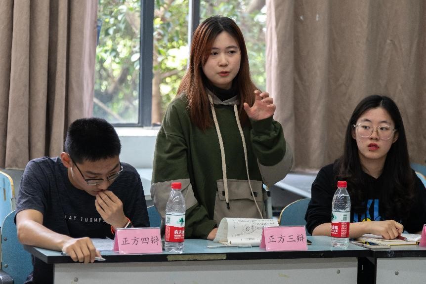随后,由正方“你不对我对” 队和反方“辩论青春”队围绕“疫情防控重在道德自律还是法律约束”这一辩题展开激烈辩论。