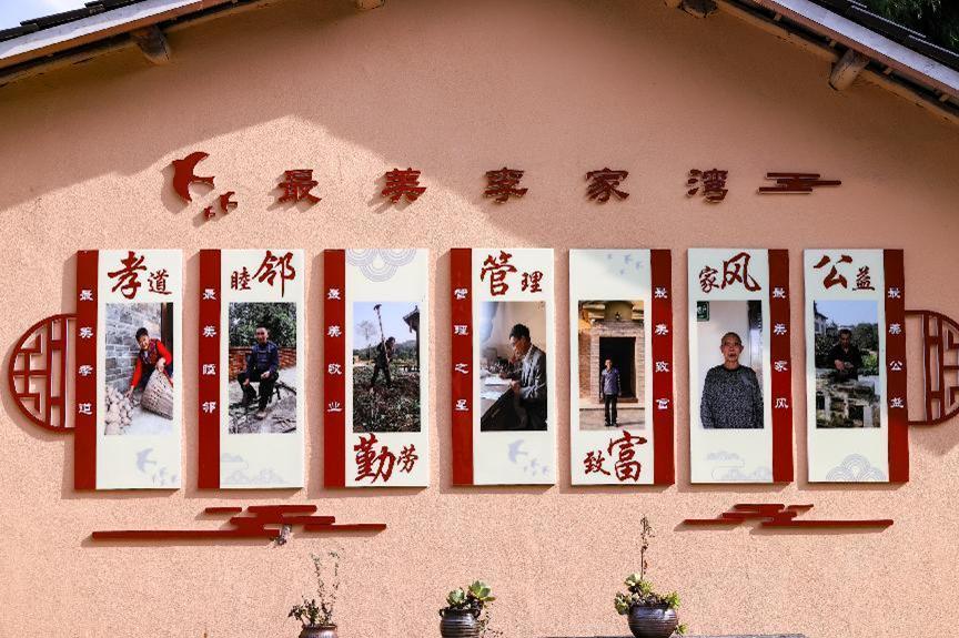 “共享”必须以“共治”为基础,全民参与是关键。据了解,当地建立“基层党建+驻院联户”工作小组整治居住环境,以“共建、共治、共治、共享”为核心构建院坝式党群活动空间,是党组织联系群众的新桥梁。李家湾每家居民房屋的门前都写有家训,不仅如此,房屋侧面贴有院民公约、“守望巡逻”照片墙、“最美李家湾”代表照片墙、“撸起袖子加油干”等贴画,在全院居民的共同努力下,李家湾成为江津区农民人居环境整治项目永兴镇示范院落。