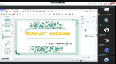 为充分发挥优秀毕业生就业典型的引领示范作用,引导在校员工提前做好学业规划和求职准备,促进老员工更充分更高质量就业,机电子2001班团支部邀请了2017级、2018级、2019级优秀学姐学长,采用腾讯会议线上开展了“师兄师姐去哪了”就业指导系列分享会,分别就考研复习、求职经历、基层就业等方面进行交流,帮助同学们明确就业目标,树立就业信心,激发就业动力,实现就业梦想。