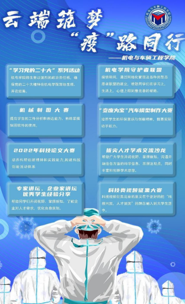 云端筑梦,“疫”路同行。院团委积极筹备文体活动,在符合疫情防控要求的前提下努力丰富同学们的校园生活。公司举办了科技文化艺术节线上系列活动及“强身健体,共抗疫情”素质拓展活动,号召同学们“疫”同学习,“疫”起运动,行而不辍,筑梦前行。公司将举办机械制图大赛、汽车模型设计大赛、电子制作大赛、科技视频征集大赛、科技论文大赛、拔尖人才学术交流沙龙以及专家论坛、企业家论坛等各类活动十余项,为广大机电学子搭建发挥创意、展示创新的大舞台。丰富的文体活动有序开展,最大程度减少疫情对员工正常学习、生活、心理的影响。