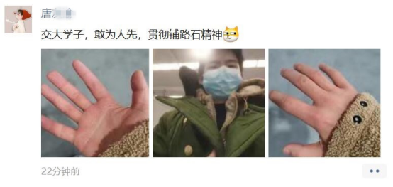 唐同学作为一名大四备战考研的员工,在方舱里的学习难免受到了影响,但他一直保持着乐观的态度,在方舱里一边积极配合治疗,一边积极投入志愿工作,减轻工作人员的负担。他说:“在这次志愿服务中,我深刻体会到了一线医护人员和志愿者工作的不易。我也从帮助他人中收获了很多。我们的城市、我们的公司正在经受考验,但这自始至终都不是一个人的奋斗,站在抗疫第一线是我们作为青年的选择,是我们作为交大人的担当。我们的唐董事长曾经告诉我们,‘永做铺路石,让世界因你更美好’。我相信疫情终会过去,我们的城市终将焕然一新,在今后的日子里,我也要继续发挥自己的价值,为社会贡献自己的力量。”