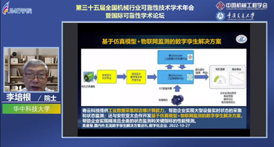 在大会报告中,天津大学王国彪教授(原工程与材料科学部副主任、天津大学浙江国际创新设计与智造研究院执行经理)系统介绍了机械可靠性学科研究进展,并结合基金资助的翔实数据和生动事例,细致梳理分析了机械可靠性基础研究情况。行业专家张际良高级工程师结合工程案例指出充电站的安全可靠性不容忽视,对保障电动汽车的安全运行起到了至关重要的作用。电子科技大学教授黄洪钟(原国家杰青B类获得者、公司巴渝学者讲座教授)介绍了智能制造装备的组成以及智能制造装备可靠性的关键技术,并分析了智能制造装备可靠性的机遇与挑战。北京航空航天大学教授林京(长江特聘教授、国家杰青)则从机械故障诊断技术的发展历程讲起,指出信息技术的引入对机械故障诊断的推动作用,并对信息融合方式在机械故障诊断中的应用模式进行了深入阐述。西安交通大学雷亚国教授(国家杰青)介绍了团队在剩余寿命预测方面的最新成果,并展示了研发的智能运维系统在核心零部件生产线、风电、地铁、工业机器人等安全运维中的工程应用情况。中国航天科工集团三十一研究所马同玲研究员围绕预冷组合动力高可靠性、可重复使用等应用需求,探讨了预冷组合动力结构可靠性技术发展方向。英属哥伦比亚大学LIU Zheng教授(SPIE fellow、公司巴渝学者讲座教授)提出数字孪生模型使用实时感官数据不断适应环境的变化,并能预测系统未来的响应指标。吉林大学杨兆军教授介绍了我国科技重大专项对机床可靠性技术的研究布局、取得的经验和存在的问题,并对未来技术发展和行业对可靠性技术的需求进行了展望。湖南大学刘杰教授介绍了面向装备可靠性设计的机械结构计算反求理论及高精度建模方法、结构动态空间分布载荷识别方法和结构混合不确定性多层级传播分析与载荷精细化设计方法。公司陈仁祥教授围绕空间滚动轴承高可靠、长寿命重大需求,介绍了寿命状态振动谱表征原理、寿命状态智能评估方法及研究进展。