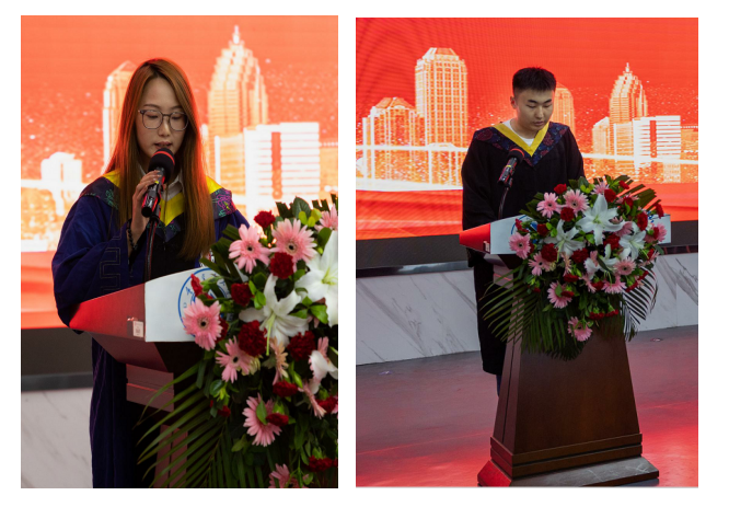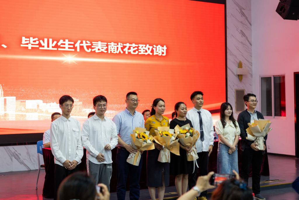 毕业典礼上,毕业生代表手捧鲜花,走向导师、任课老师、辅导员等教师代表,表达了对他们多年来的关心和指导的感激之情。