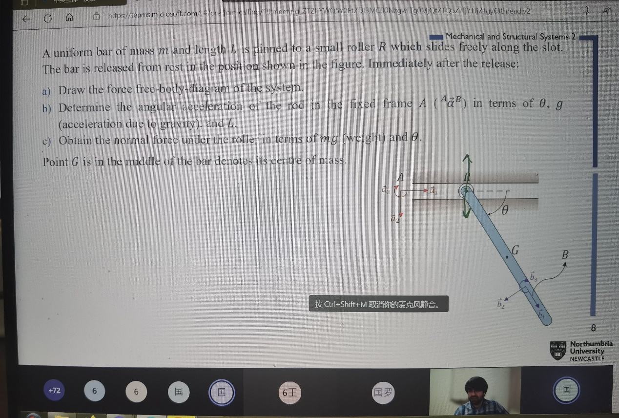 第一周由Dr Hamed Farokhi 为同学们讲解Mechanical and Structural Systems课程,本次课程从动力学与运动学两大板块进行细致入微的讲解,外教老师简洁幽默的讲解方式在提高课堂积极程度的同时也使同学们对这些知识的理解更加清晰,同时外教老师也通过课中即时练习的方式巩固同学们所学到的知识,使同学们受益匪浅。
