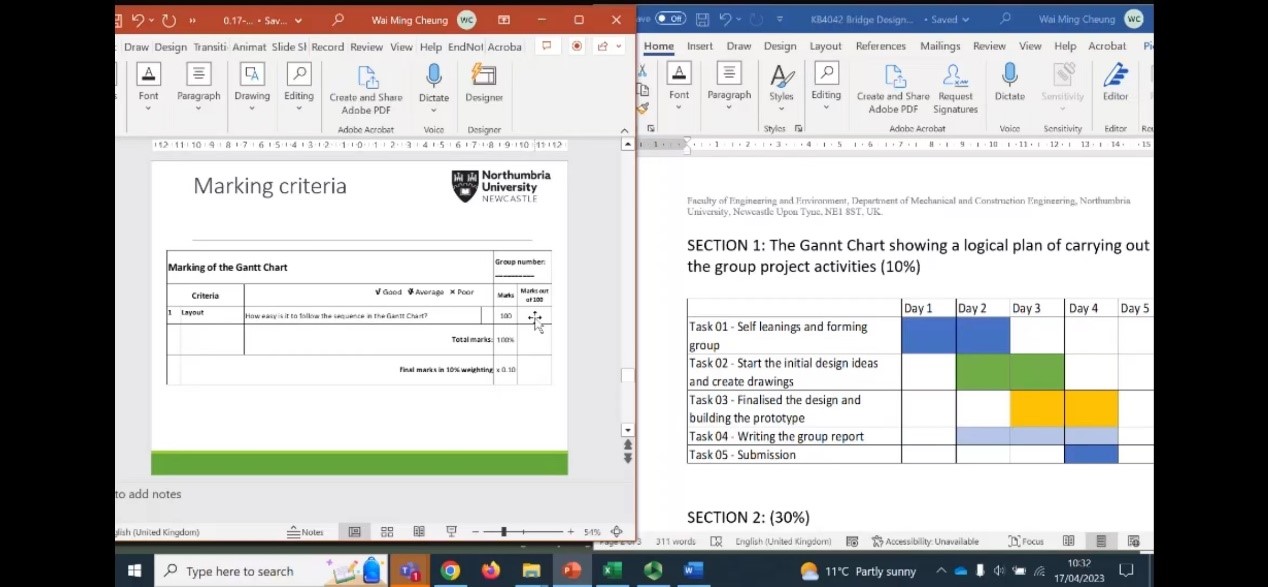 第八周Dr. Wai Ming Cheung讲述的是有关桥梁设计以及设计报告方面的知识。外教老师从Gantt Chart由简入深讲到桥梁的结构设计以及承重测试,详细地让同学们了解到合作设计的步骤和分工操作,教导同学们以小组合作的形式完成了桥梁设计汇报工作,同时在教学活动中热情回应同学们的问题。同学们在本周的外教课堂上不仅收获到合作实操的实践经验,也在同外教老师积极探讨的交流中收获了丰富的理论知识。