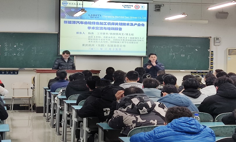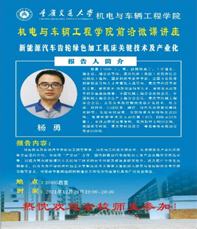 为开阔员工专业领域科技发展前沿视野,了解机械产品绿色制造技术与装备方面的知识,MK体育于2021年12月28日邀请重庆机床(集团)有限责任公司杨勇教授级高工做了题为“新能源汽车齿轮绿色加工机床关键技术及产业化”专题讲座。本次讲座共计有近150余名本科生、硕士生及部分青年教师现场听取了讲座。