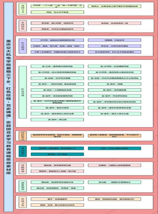 实践团将思政小课堂和社会大课堂紧密结合,挖掘党史学习实践要素,创新思政课实践教学,收集整理了重庆百年党史重要精神,成立党史学习教育宣讲团,构建了“红色征程·党史铸魂”课程思政素材库。素材库包含了爱国主义、家国情怀、红岩精神、红色足迹、国防教育、廉洁教育、两路精神、创新精神、传统文化共九个专栏,致力于推动青年员工学党史、强信念、跟党走,讲述红色故事,激发青春使命,切实推动“3+5+X”基层党建落地生效,深度融合助推“大思政课”建设。