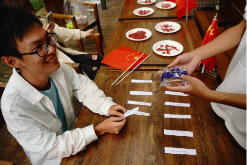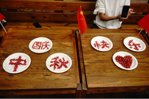 石榴籽的红是中国红,机电学子们用石榴籽拼成了各式各样的中国红图案和中国红文字。“国庆”、“中秋快乐”、“我爱中国”、“祖国母亲生日快乐”......同学们细心摆放,拼成的字体表达了同学们作为中国人的自豪感和浓浓的爱国之情。